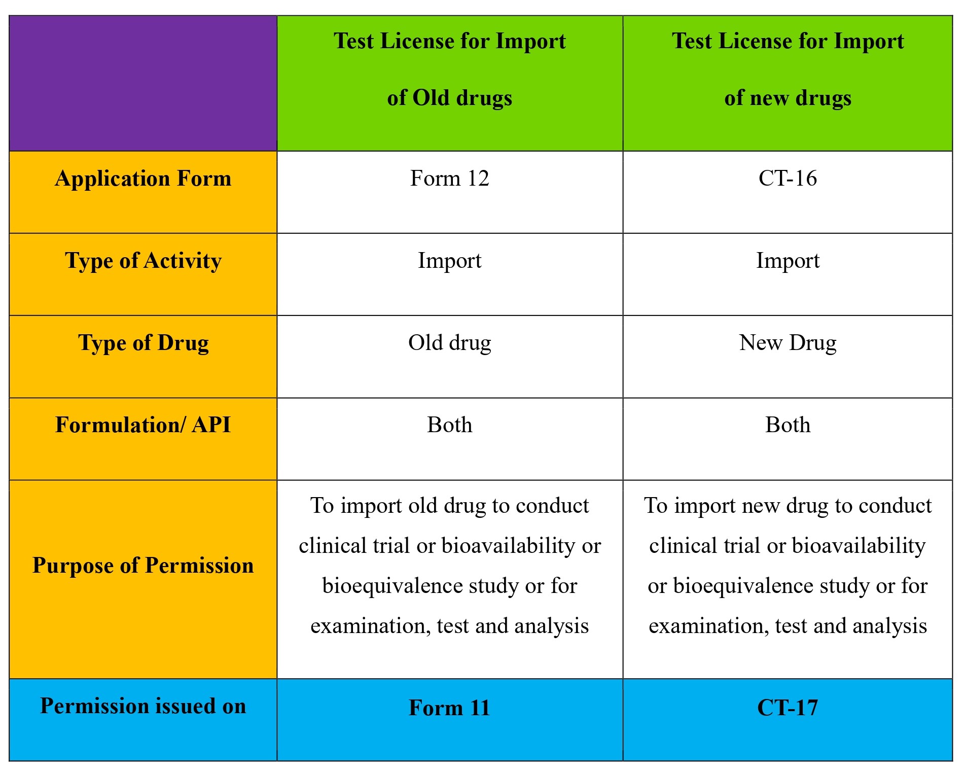 Is there a difference between test license application for importing old drug and new drug: Yes, there is a difference as for old drug you need to make an application on Form 12 and you will be issued Form 11 by CDSCO. However, for new drugs the application is to be made on CT-16 and CT-17 will be issued by CDSCO.